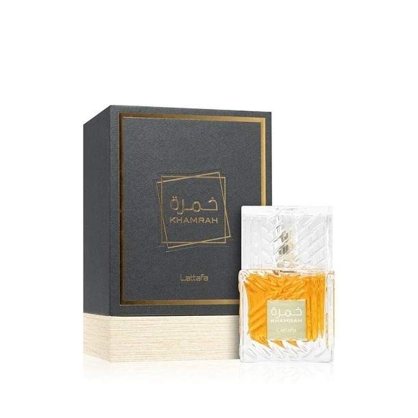 Khamrah de Lattafa Perfumes es una fragancia de la familia olfativa Aromática Especiada para Hombres y Mujeres. Esta fragrancia es nueva. Khamrah se lanzó en 2022. Las Notas de Salida son canela, nuez moscada y bergamota; las Notas de Corazón son dátiles, praliné, nardos y Mahonial; las Notas de Fondo son vainilla, haba tonka, mirra, Amberwood, Akigalawood y benjuí.