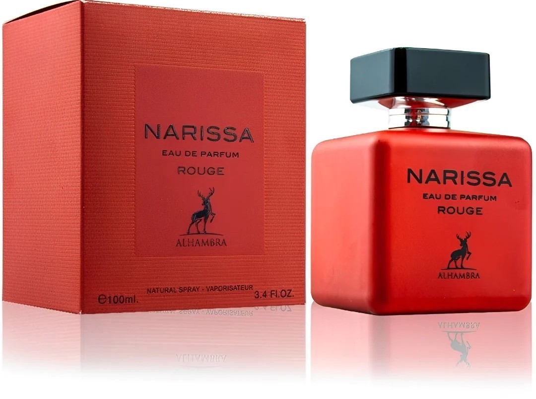El perfume Maison Alhambra Narissa Rouge presenta notas iniciales de rosa búlgara e iris, un corazón con almizcle, flor de naranjo y nardos, y una base de sándalo, vetiver, vainilla, haba tonka y cedro blanco. De larga duración y con proyección moderada.